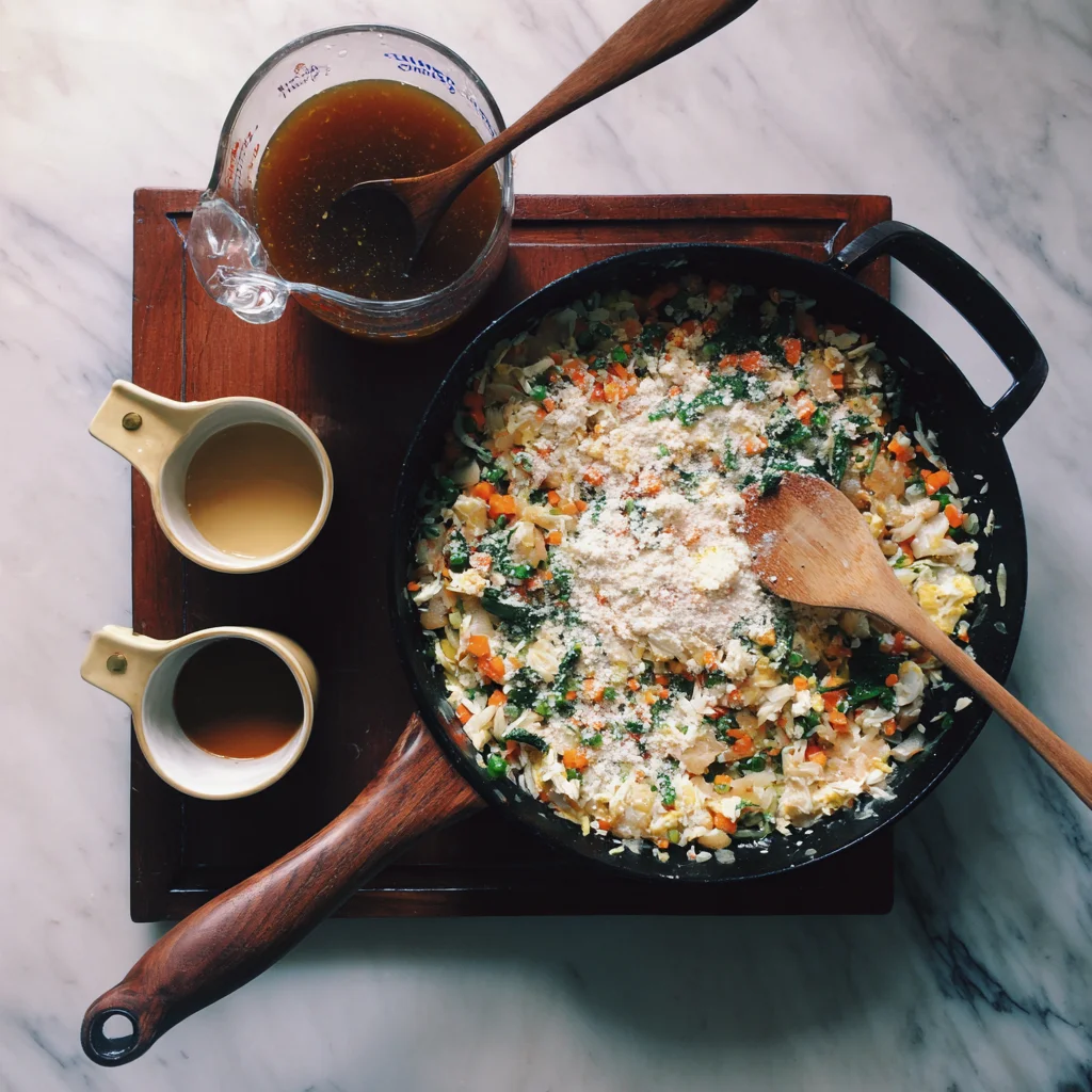 Now we’re getting into the good stuff. Sprinkle 2 tablespoons of flour over the sautéed veggies, stirring it in to coat everything evenly. This helps thicken your sauce so it’s velvety and creamy when baked.