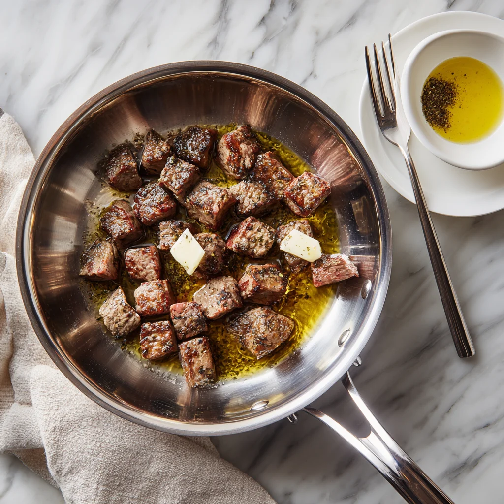 Next, return the seared steak tips (and any juices that may have collected) back to the skillet. Stir everything together and let it warm over low heat for a minute or two. This helps the flavors meld and ensures the steak is heated through without overcooking it.