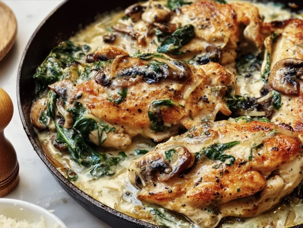 Chicken with spinach and mushrooms is a comforting skillet meal full of earthy flavor and creamy texture. Juicy chicken breasts are seared until golden and then simmered in a garlic-infused cream sauce with tender mushrooms and fresh spinach. It’s a wholesome and satisfying dish that comes together quickly, making it ideal for busy weeknights while still being elegant enough for a cozy dinner with guests.