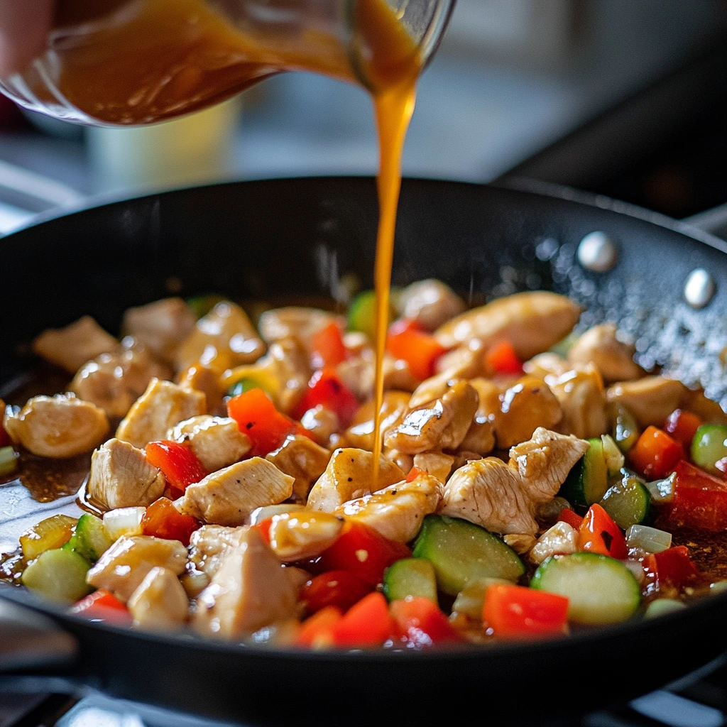 Return the cooked chicken to the skillet with the vegetables. Pour the prepared sauce over the mixture and toss everything together to coat evenly. Let it cook for another 2 to 3 minutes, allowing the sauce to thicken and cling to the ingredients.