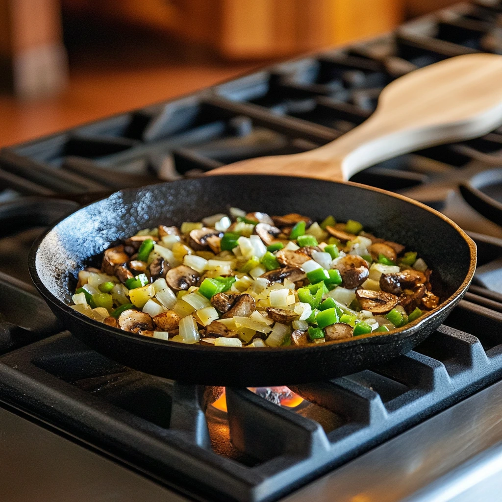 4️⃣ Heat a drizzle of oil or a small amount of butter in a skillet over medium-high heat. Sauté the onion, green bell pepper, and mushrooms for 5 to 7 minutes until softened and lightly caramelized.