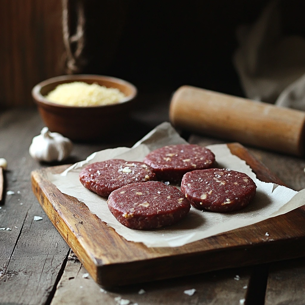Once everything is well combined, divide the mixture into four equal portions. Shape each portion into a patty about ¾ inch thick. For the best results, press a small indentation into the center of each patty with your thumb—this keeps the burgers from puffing up while cooking.