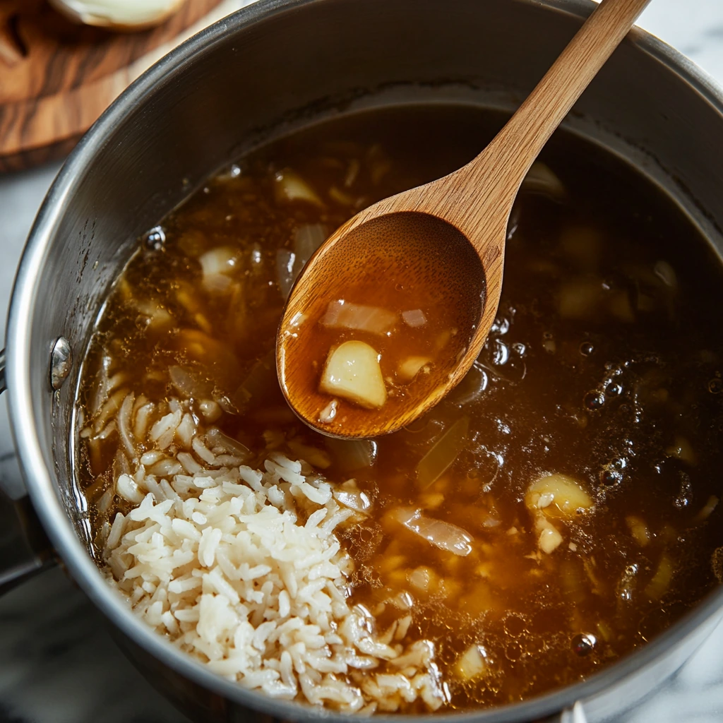 Pour in the beef broth and bring it to a boil. Stir in the uncooked white rice, then reduce the heat to low, cover tightly, and let it simmer for 10 minutes.