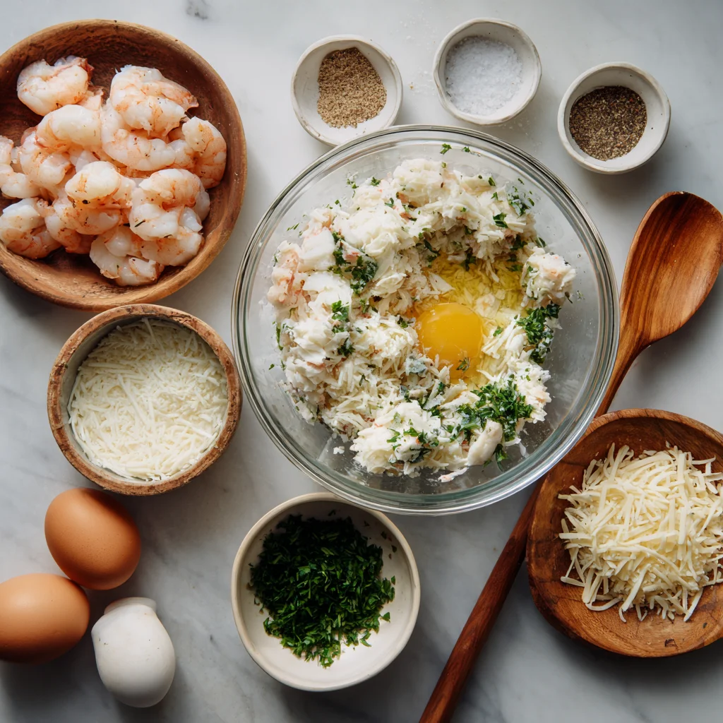 2️⃣ Make the seafood filling: In a mixing bowl, combine chopped shrimp, crab meat, ricotta, mozzarella, Parmesan, egg, minced garlic, parsley, salt, and pepper. Mix until well combined.