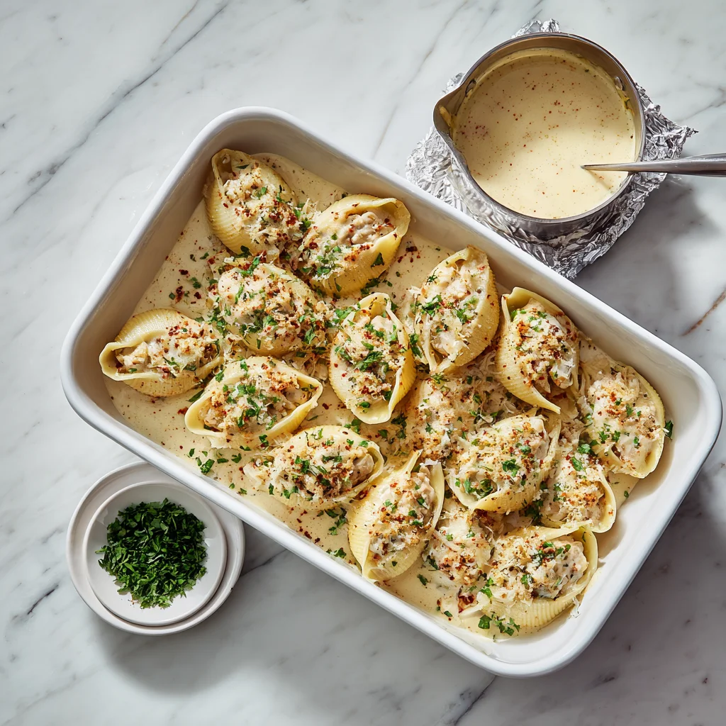 6️⃣ Pour the sauce: Pour the cream sauce evenly over the stuffed shells, making sure they are well covered.