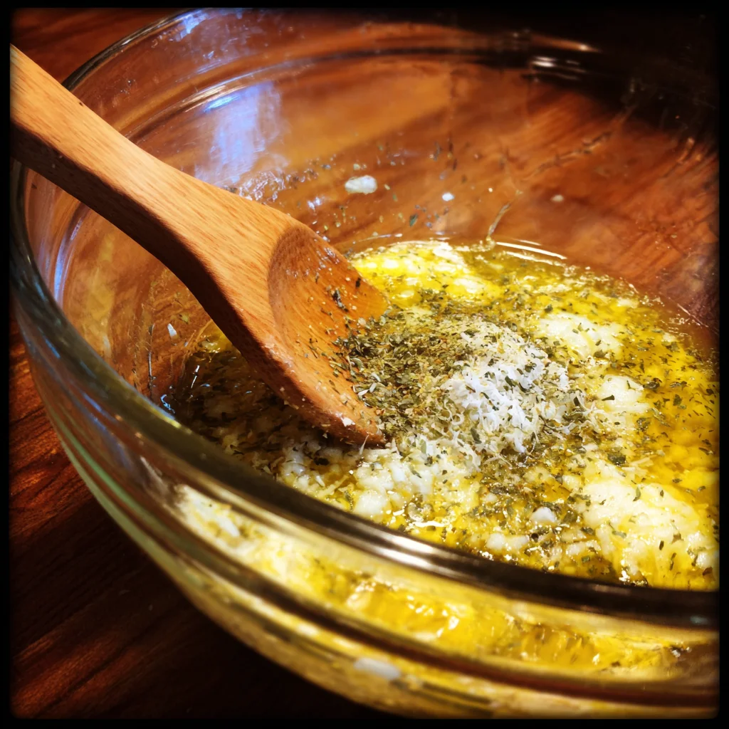2 In a small bowl, mix together the melted butter, olive oil, minced garlic, parmesan cheese, salt, pepper, paprika, and dried parsley or Italian seasoning to form a paste-like coating.