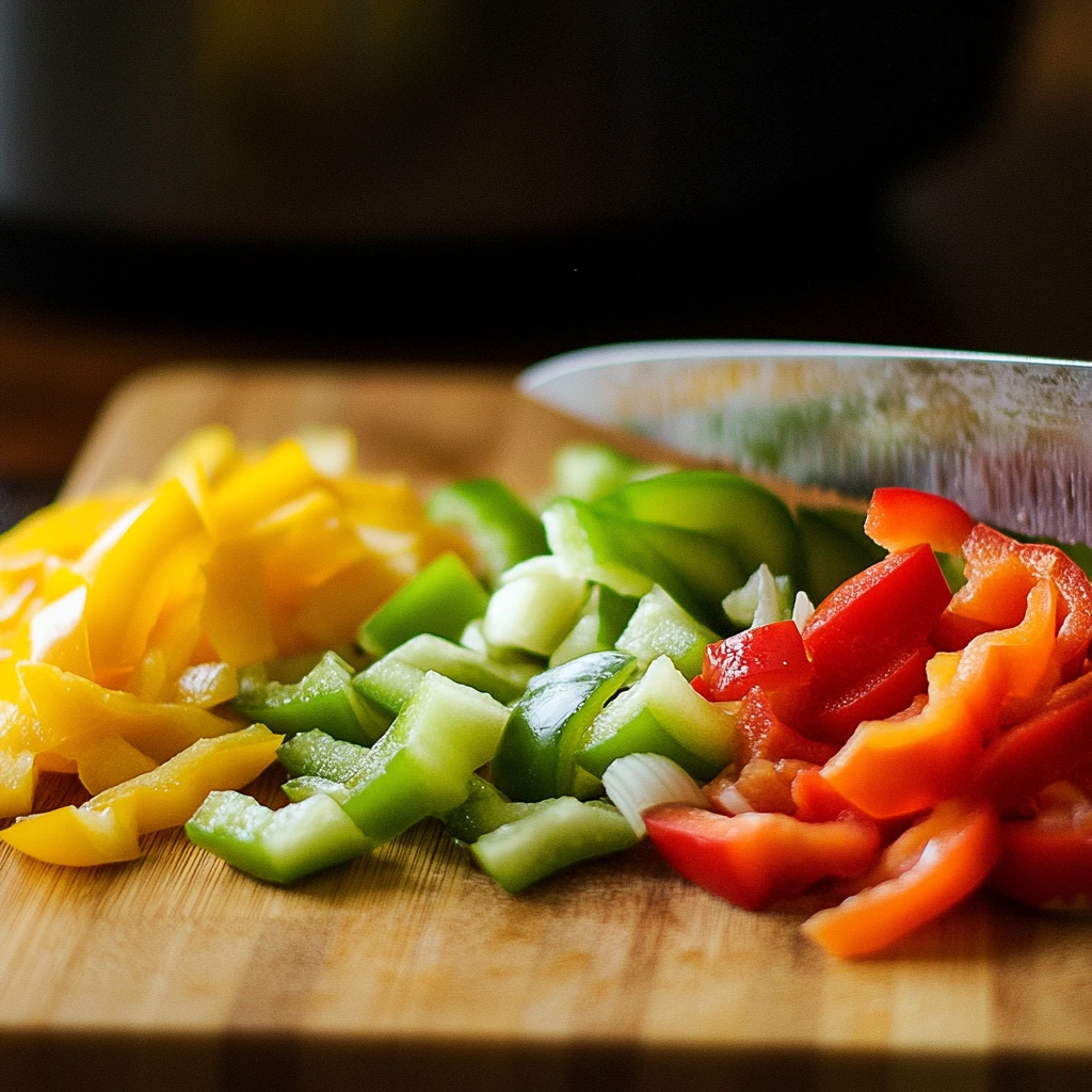 The first step is to prep your ingredients. Don’t worry—this is the easy part! Start by slicing your bell peppers and onion into thin strips. For that perfect fajita look and taste, I love using a combination of red, green, and yellow bell peppers. Not only do they add a pop of color, but they also bring a sweet, mild flavor to balance out the spices.