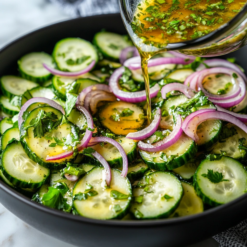 Now, drizzle that beautiful dressing over the top and gently toss everything together until the cucumbers and onions are well coated. Be careful not to overmix—those cucumber slices can bruise if handled too much. A light toss is all you need.