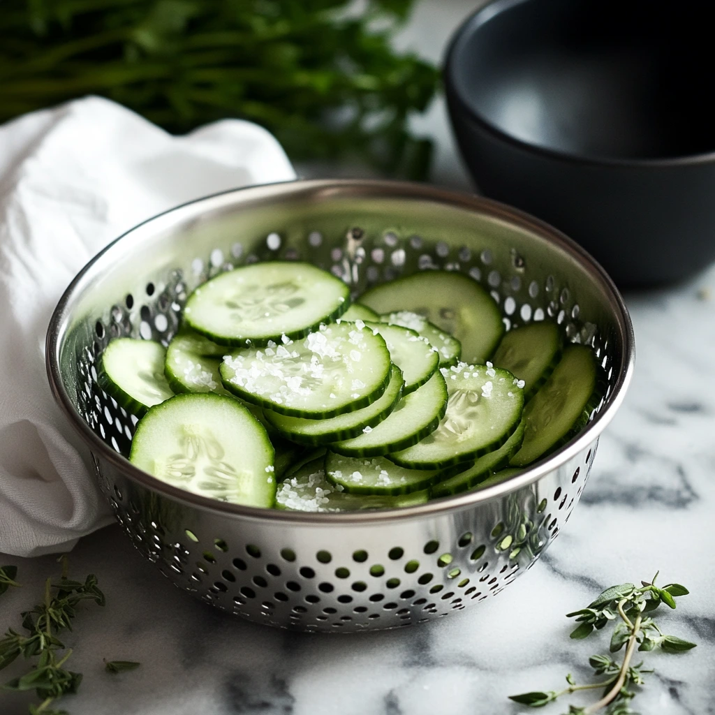 Once sliced, place the cucumbers in a colander and sprinkle them lightly with salt. Toss them around just a bit to distribute the salt, then let them sit for about 10–15 minutes. This process draws out some of the excess moisture, which keeps your salad from getting soggy. After the cucumbers have had their little spa moment, pat them dry with paper towels.