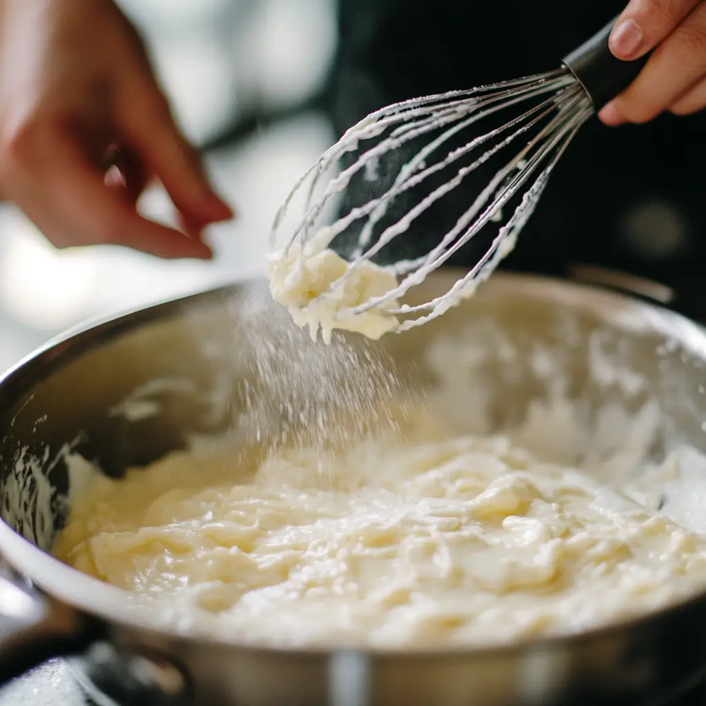 - Gradually pour in 1½ cups milk and ½ cup heavy cream, whisking constantly to keep the sauce smooth.