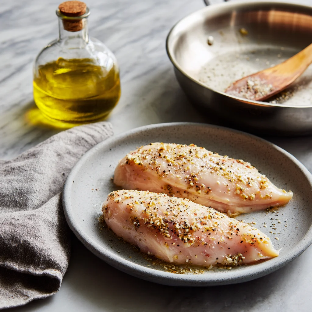 While the pasta’s boiling away, let’s focus on the chicken. You’ll need two boneless, skinless chicken breasts for this dish. Pat them dry with paper towels (this helps them brown nicely) and then season both sides generously with salt, pepper, and garlic powder.