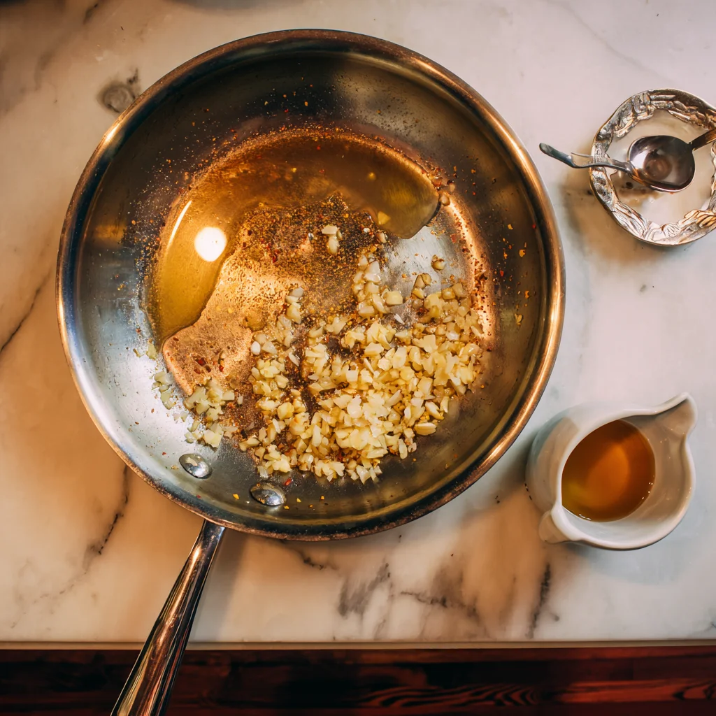 Now for the flavor! Using the same skillet (don’t wash it—those little browned bits are pure gold), turn the heat down slightly and toss in your minced garlic. Let it cook for about 30 seconds, just until fragrant. Be careful not to burn it—it cooks fast.