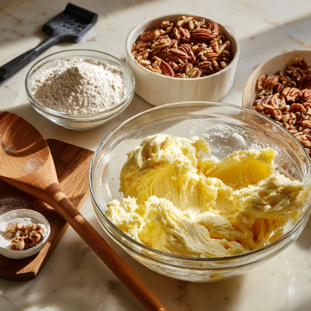 Next, add the flour and mix until a crumbly dough forms. Don’t overmix—it should resemble coarse crumbs that hold together when pressed.