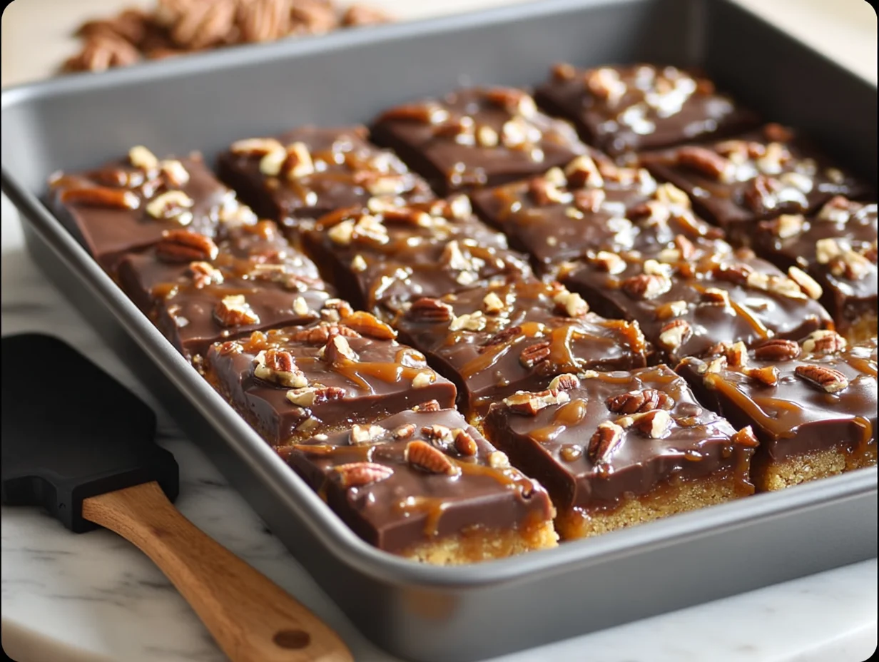This caramel-pecan layer is what gives turtle bars their signature texture—rich, chewy, and just a little bit sticky in the best way.