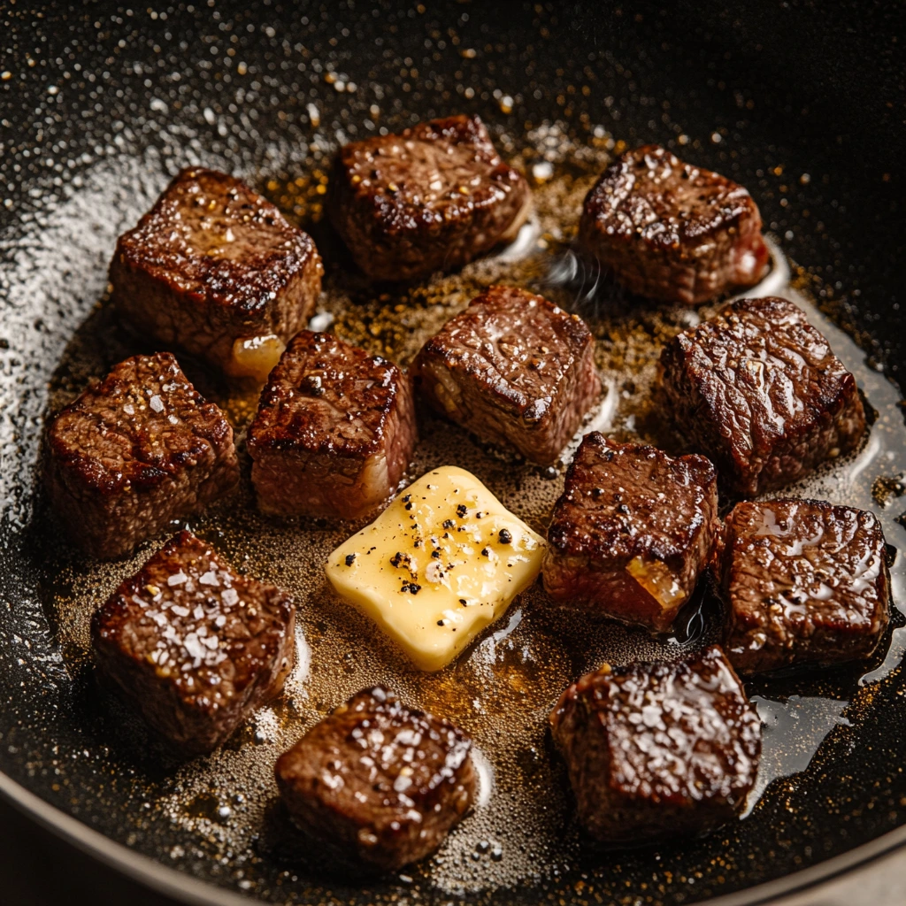 Pat the steak bites dry with a paper towel and season generously with salt and pepper. Heat a large skillet over medium-high heat and add 1 tablespoon of butter. Once the butter is melted and sizzling, add half of the steak bites in a single layer. Sear for 1–2 minutes per side until golden brown. Remove the steak from the skillet and set it aside. Repeat with the remaining steak bites, adding the second tablespoon of butter if needed.