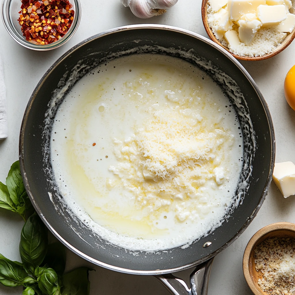 Next, pour in the heavy cream, stirring to combine. Bring it to a gentle simmer, allowing the cream to thicken just a little bit. Then, add in the grated Parmesan cheese. Stir it into the cream and keep whisking until the cheese melts completely and the sauce becomes smooth and velvety.
