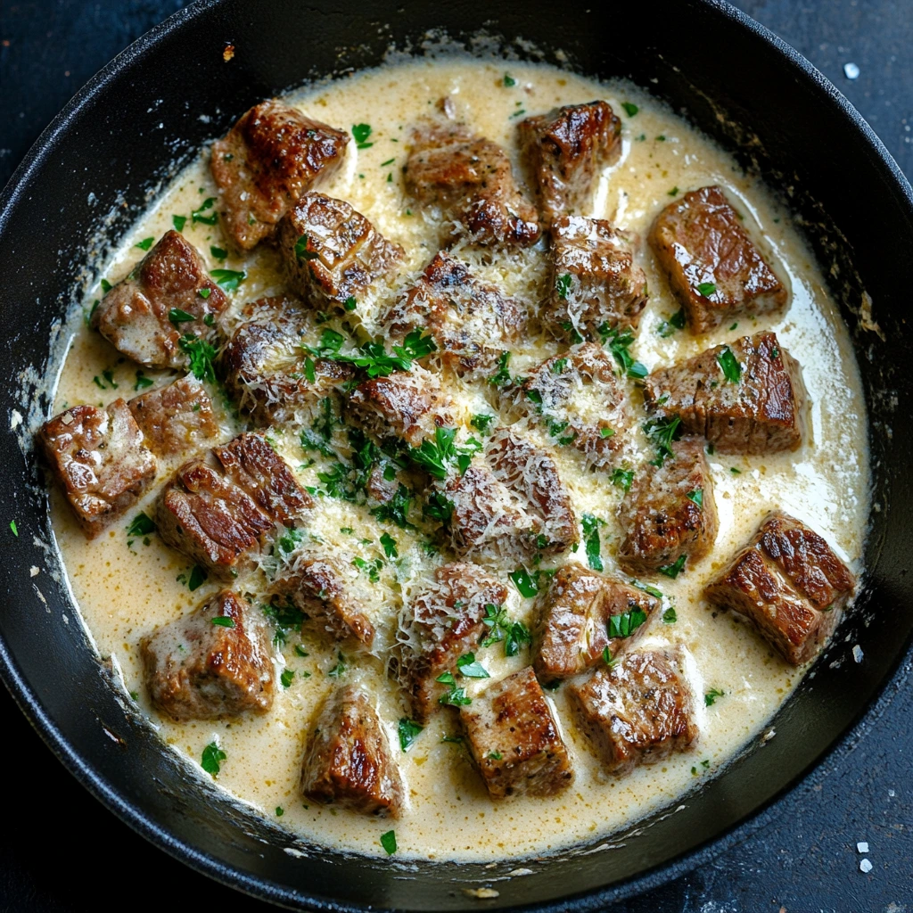 Return the steak bites to the skillet and toss them in the Parmesan cream sauce. Cook for 1–2 minutes, allowing the steak to reheat and soak up the flavors of the sauce. Remove from heat and garnish with chopped parsley if desired.