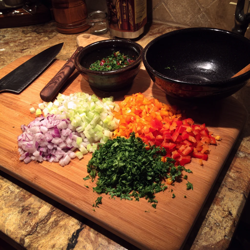 Chop the celery, red bell pepper, and red onion into fine pieces so you get a little bit of each in every bite. These veggies aren’t just for color—they add great texture and balance out the richness of the dressing.