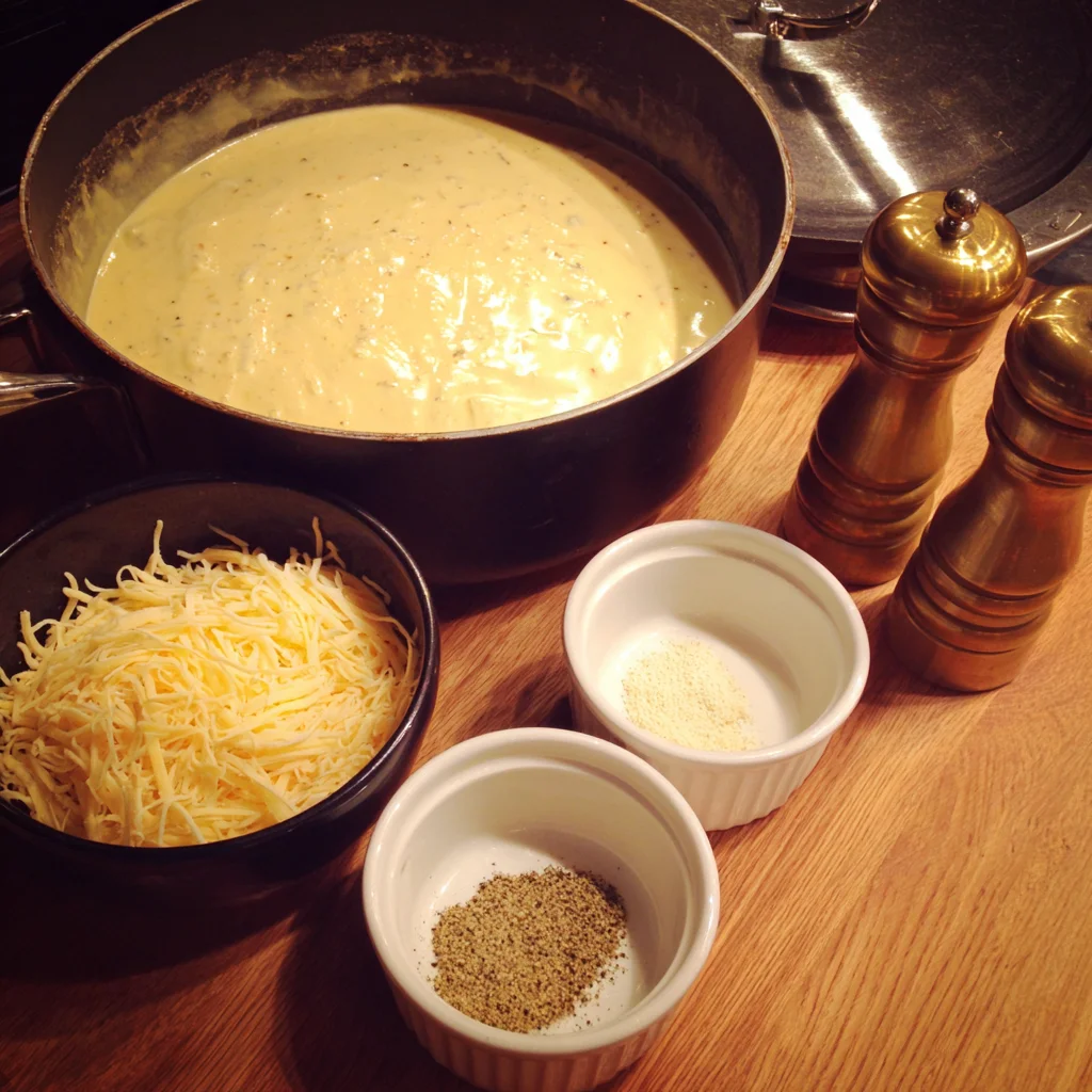Add garlic powder, salt, and pepper. Taste the sauce and adjust the seasoning if needed. Depending on your cheese, you might want to add a pinch more salt or even a touch of mustard powder for a little tang.