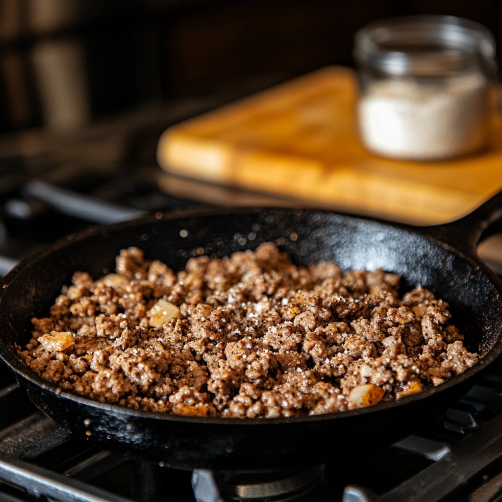 In a large skillet over medium-high heat, add 1 pound of lean ground beef along with 1 teaspoon garlic powder, 1 teaspoon salt, and ½ teaspoon black pepper. Cook, breaking it up with a spoon, until the beef is browned and no longer pink.