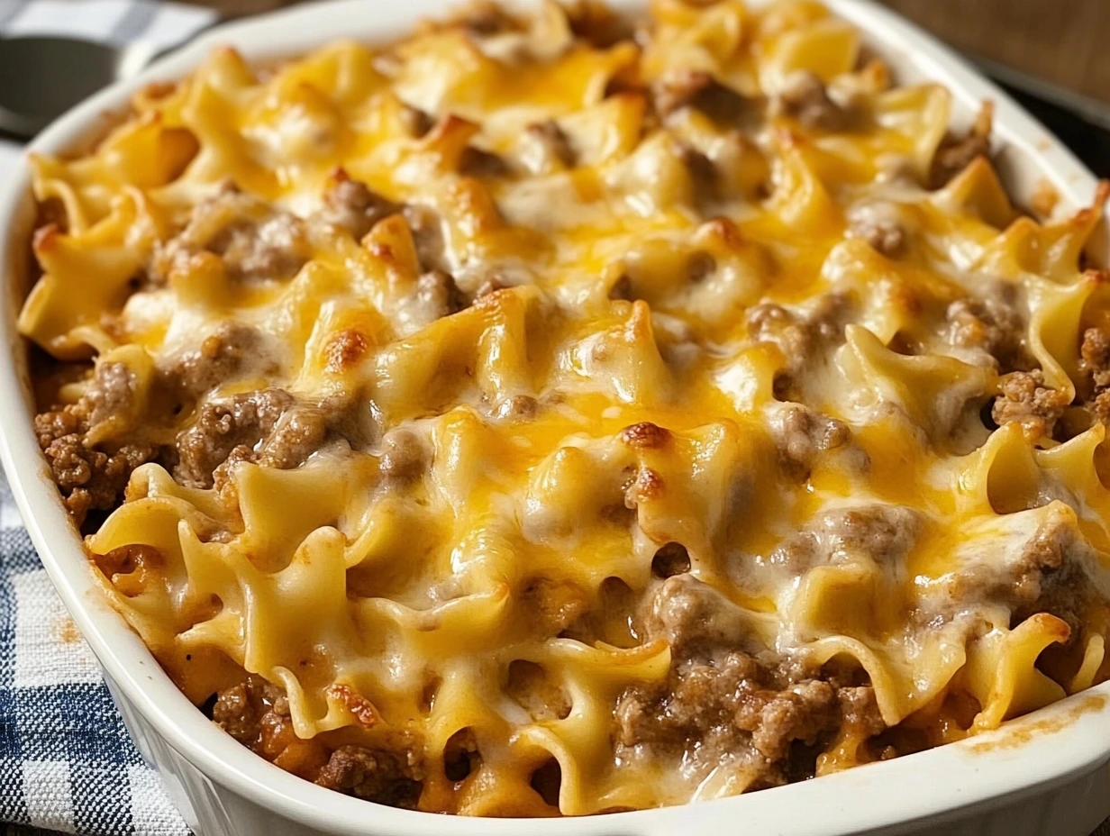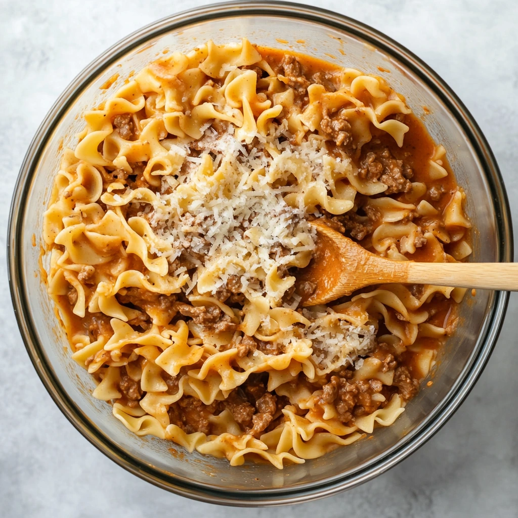 Once everything is mixed, pour the mixture into your greased 9×13-inch baking dish, spreading it out evenly with a spoon or spatula. This ensures that every bite has the perfect balance of noodles, beef, and sauce.