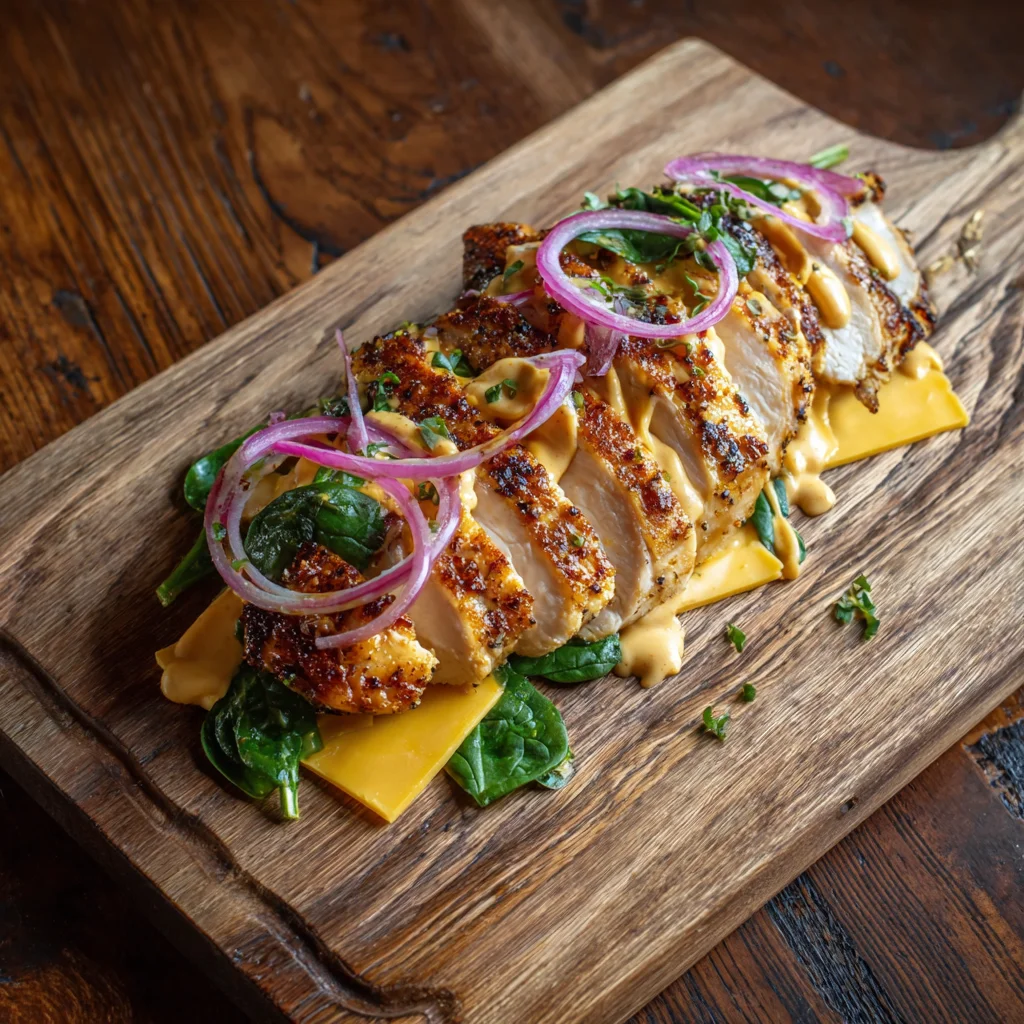 Next, layer on the smoked gouda. If you’ve never had gouda melted on a sandwich before, prepare yourself — it’s buttery, a little smoky, and melts like a dream. Add your shredded or sliced cooked chicken right on top of the cheese. Then sprinkle on your red onions — pickled if you have them for an extra tangy bite, or thinly sliced fresh ones work just fine.