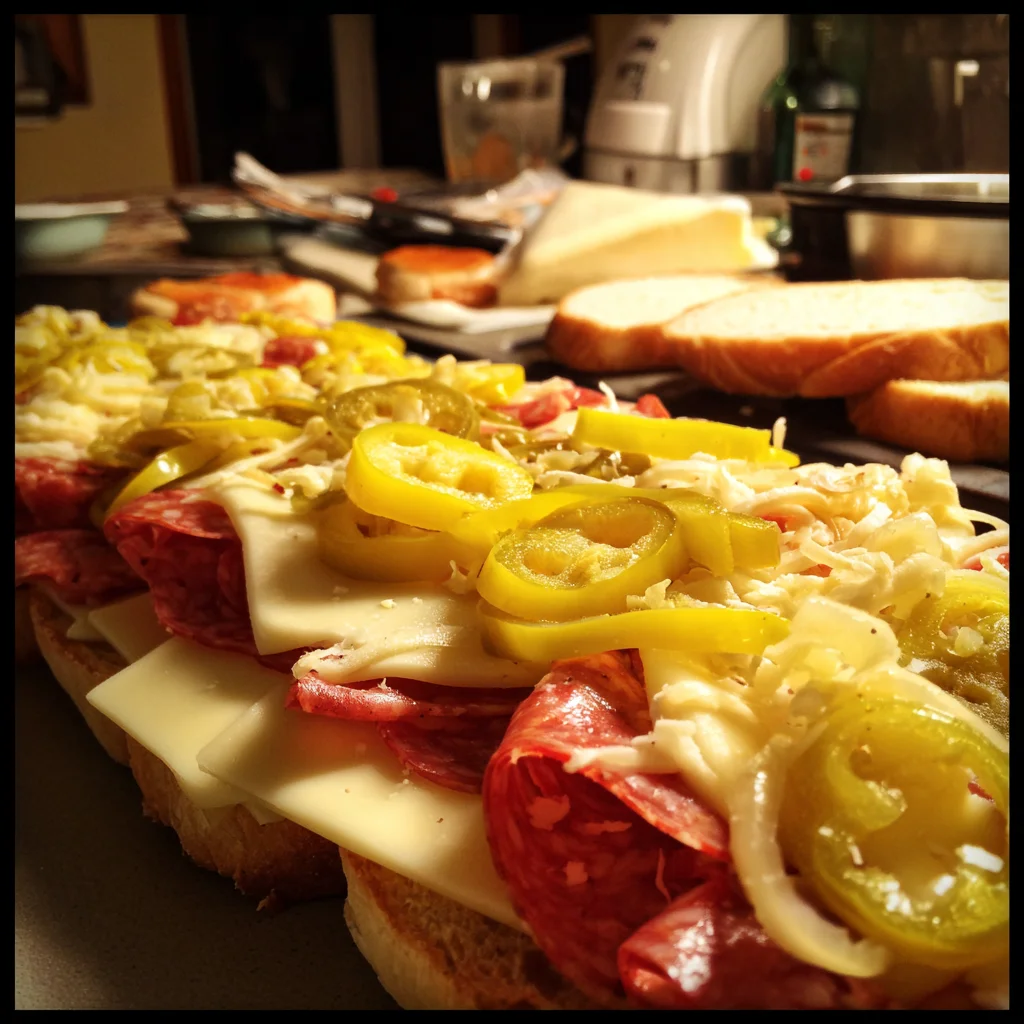 Now for the fun part—layering! Start with the salami, then add the pepperoni, and finish with the ham or capicola. Be generous—you want every bite to be packed with bold flavor. After the meats, layer on your slices of provolone or mozzarella cheese, followed by a handful of banana peppers for that tangy kick.