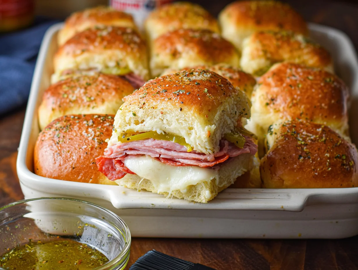 The magic here is in the layering—salami, pepperoni, ham, melty provolone, and those zesty banana peppers tucked inside soft slider rolls. And don’t even get me started on the buttery topping. Garlic, Italian herbs, a little sprinkle of Parmesan? It’s flavor city, and everyone’s invited.