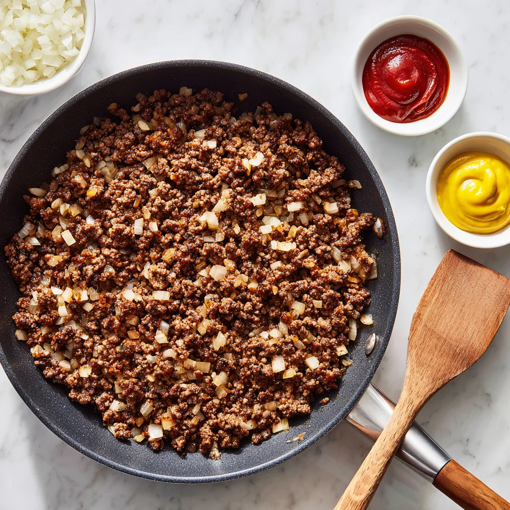 Add pickles: Chop up a few dill pickles and mix them right into the cooked beef mixture. It gives that tangy bite you’d expect from a real cheeseburger.