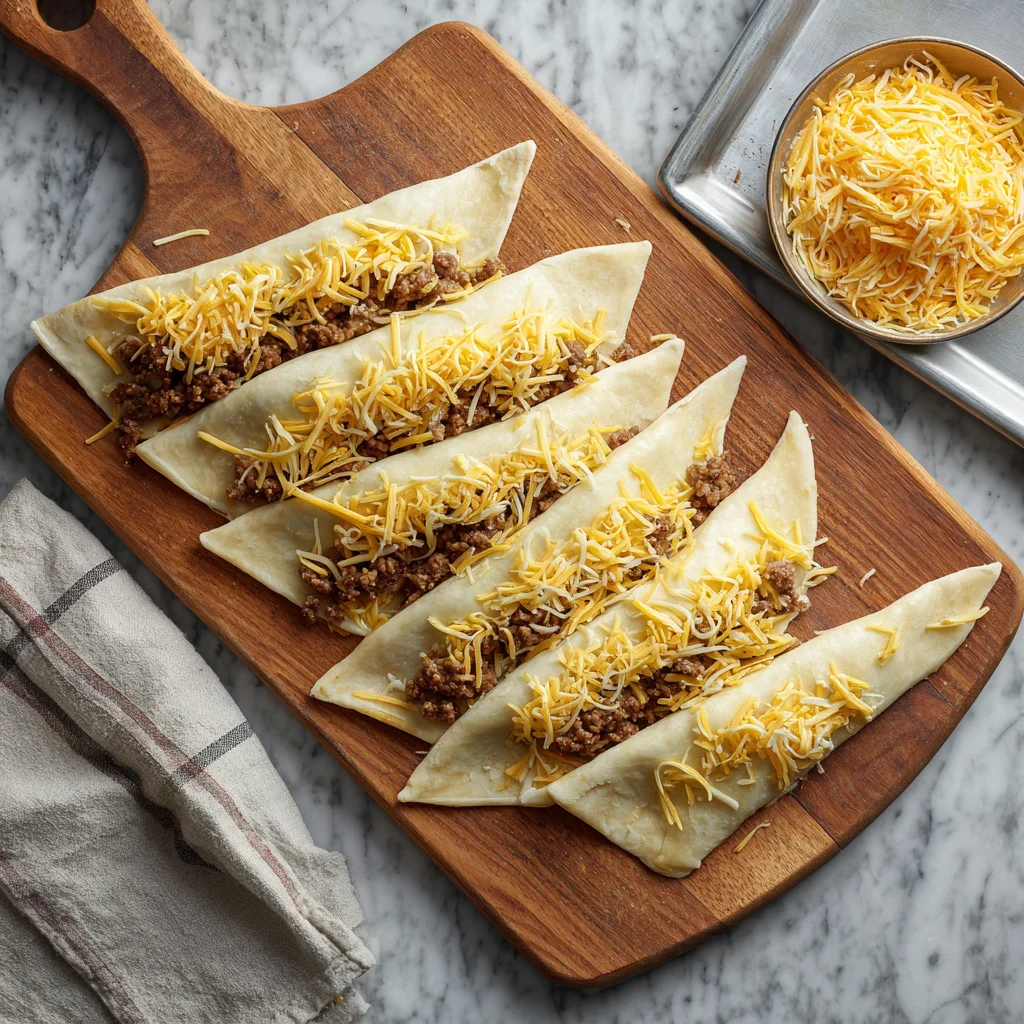 3️⃣ Unroll the crescent dough and separate into triangles. Spoon a generous portion of the beef mixture and some shredded cheddar onto the wide end of each triangle.