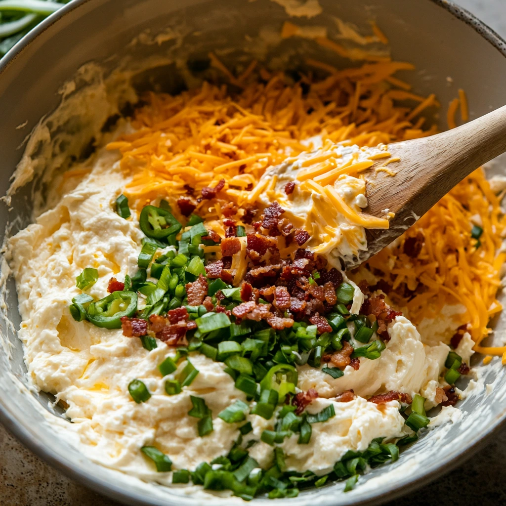 Now, let’s work on that creamy, cheesy topping. In a medium-sized bowl, combine the softened cream cheese, shredded cheddar cheese, diced jalapeños, crumbled turkey bacon, and chopped green onions. Stir everything together until well mixed. You want to make sure the cream cheese is softened beforehand because it makes mixing a lot easier, and you’ll get a smoother consistency.