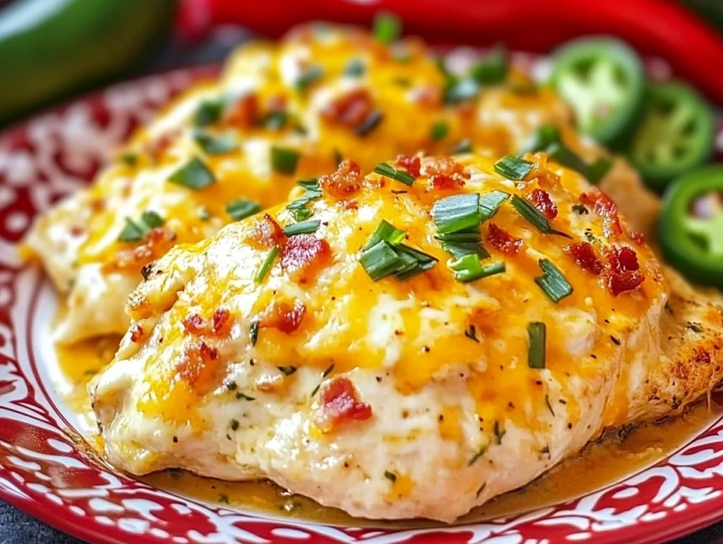Description: These Jalapeño Popper Chicken Breasts combine the smoky, creamy goodness of a jalapeño popper with tender chicken breasts, making for a flavorful and satisfying dish. The mixture of cream cheese, cheddar cheese, jalapeños, turkey bacon, and green onions creates a deliciously cheesy topping that contrasts perfectly with the juicy chicken. It’s an easy, crowd-pleasing dinner that’s sure to spice up your meal routine!
