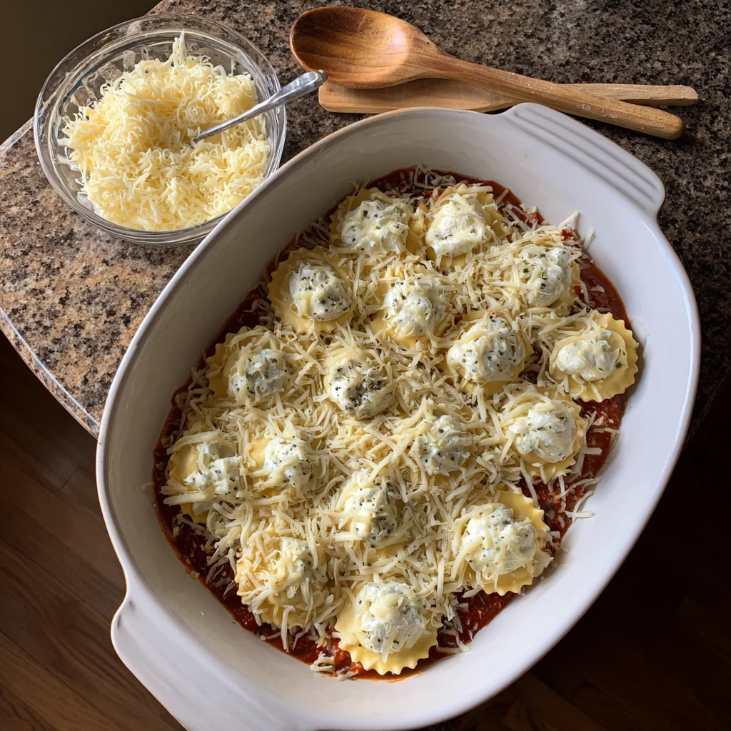 Then, spread half of the cheese mixture over the ravioli and top with 1 cup of shredded mozzarella. This is your first luscious layer — and it’s already looking like comfort food heaven
