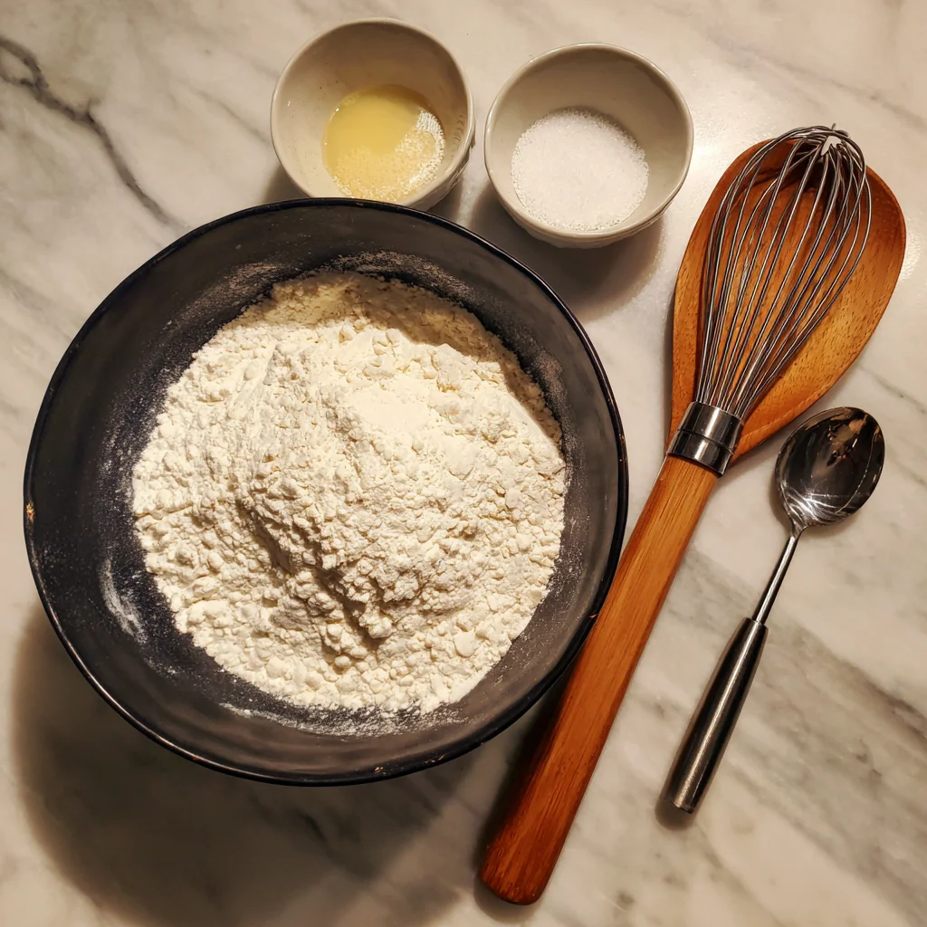 This is your dry mix base. The baking powder acts as our leavening agent here, replacing the traditional yeast. So make sure it’s fresh—old baking powder won’t give your bread that nice rise.