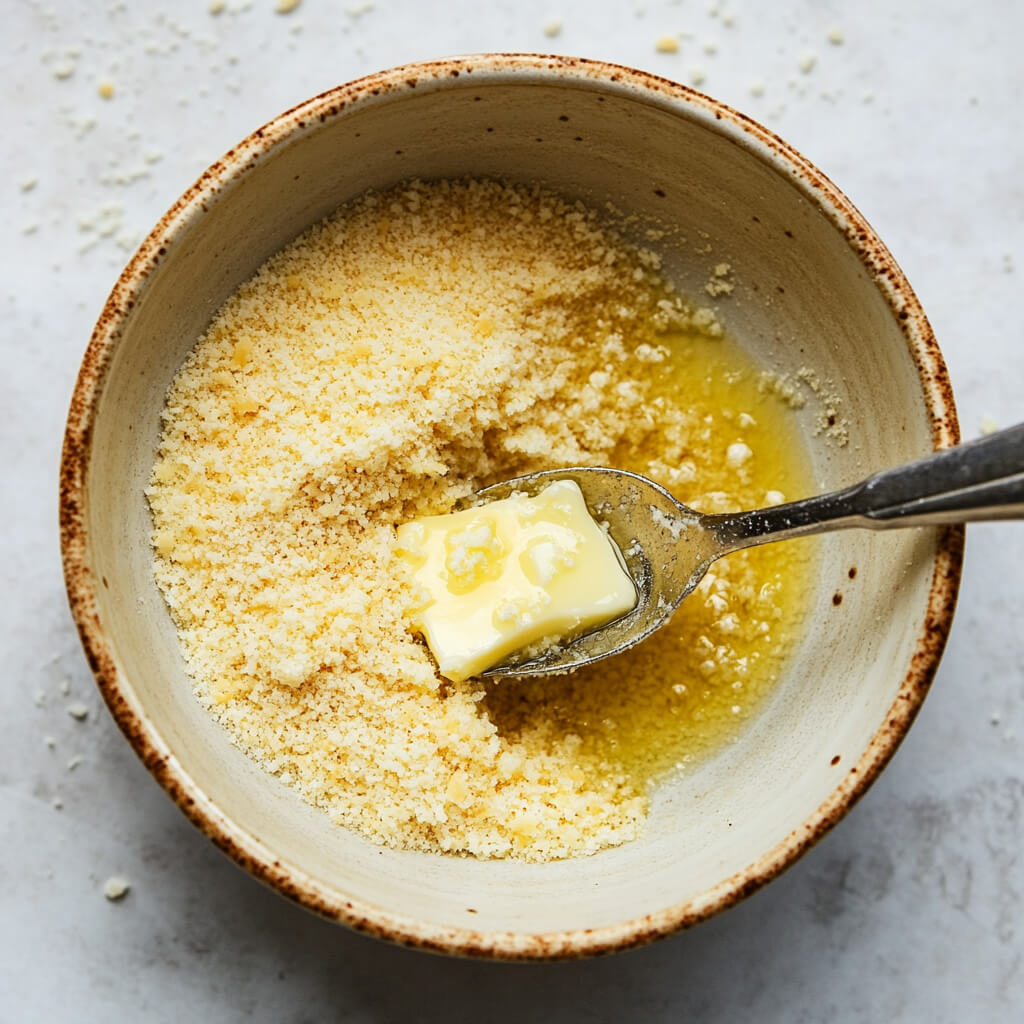 - In a small bowl, mix breadcrumbs, melted butter, and Parmesan cheese.