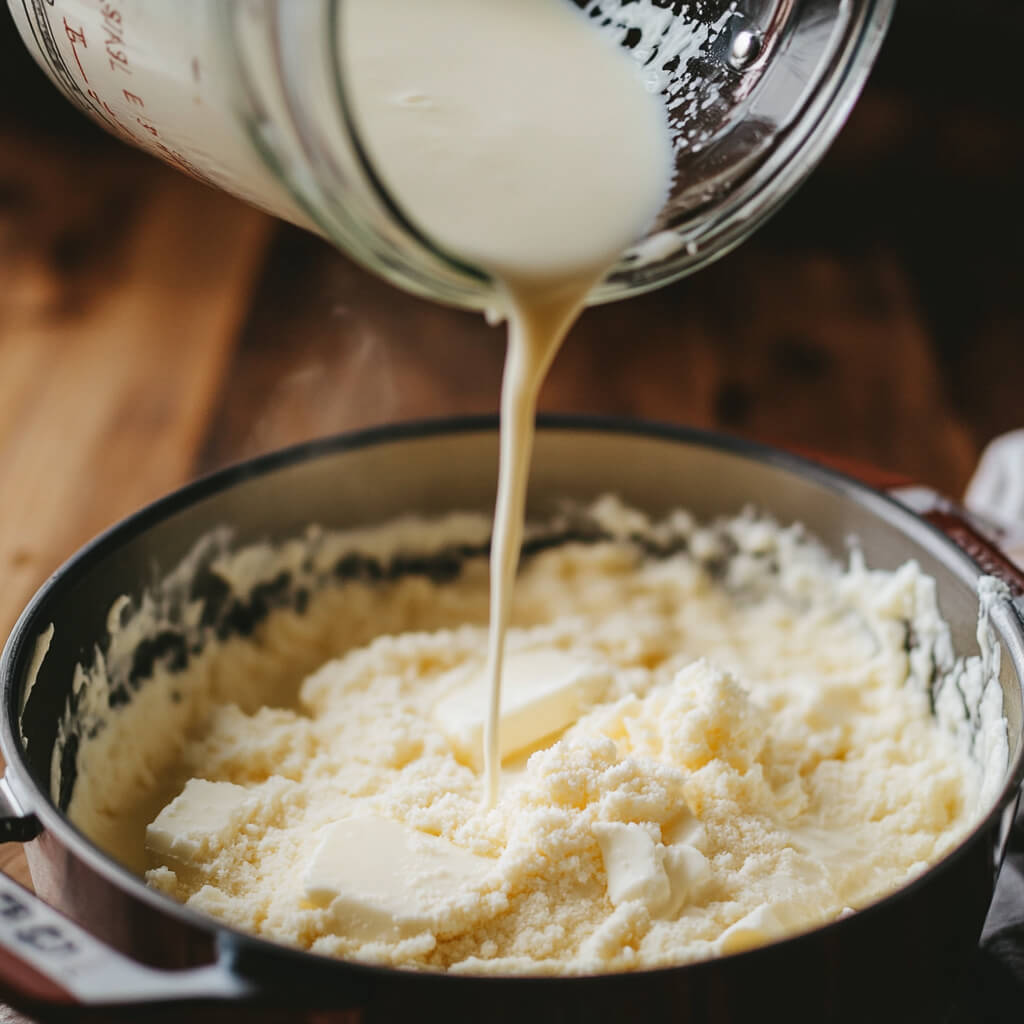 - Slowly whisk in milk and heavy cream, stirring until smooth.