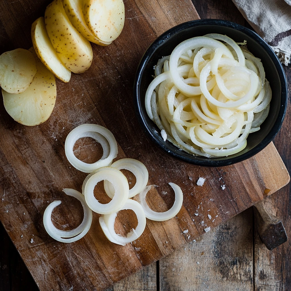 Peel and slice the onion into thin rings. Add the onion slices to the bowl with the potatoes.