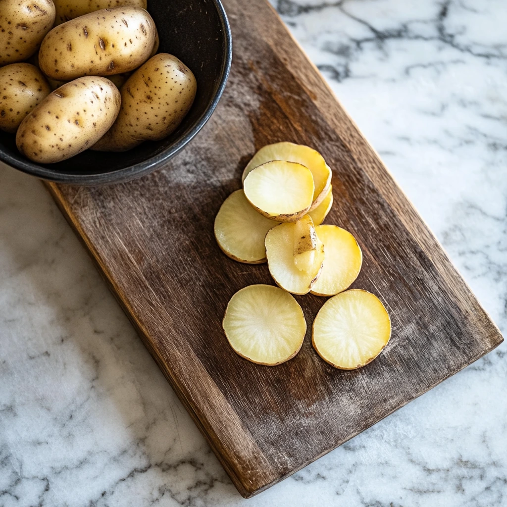 Grab your potatoes and give them a good scrub under running water—no need to peel them unless you really want to. The skin adds great texture and flavor. Slice them into 1/4-inch thick rounds. Keeping the slices uniform helps everything cook evenly, so take your time here. Once sliced, toss them into a large mixing bowl.