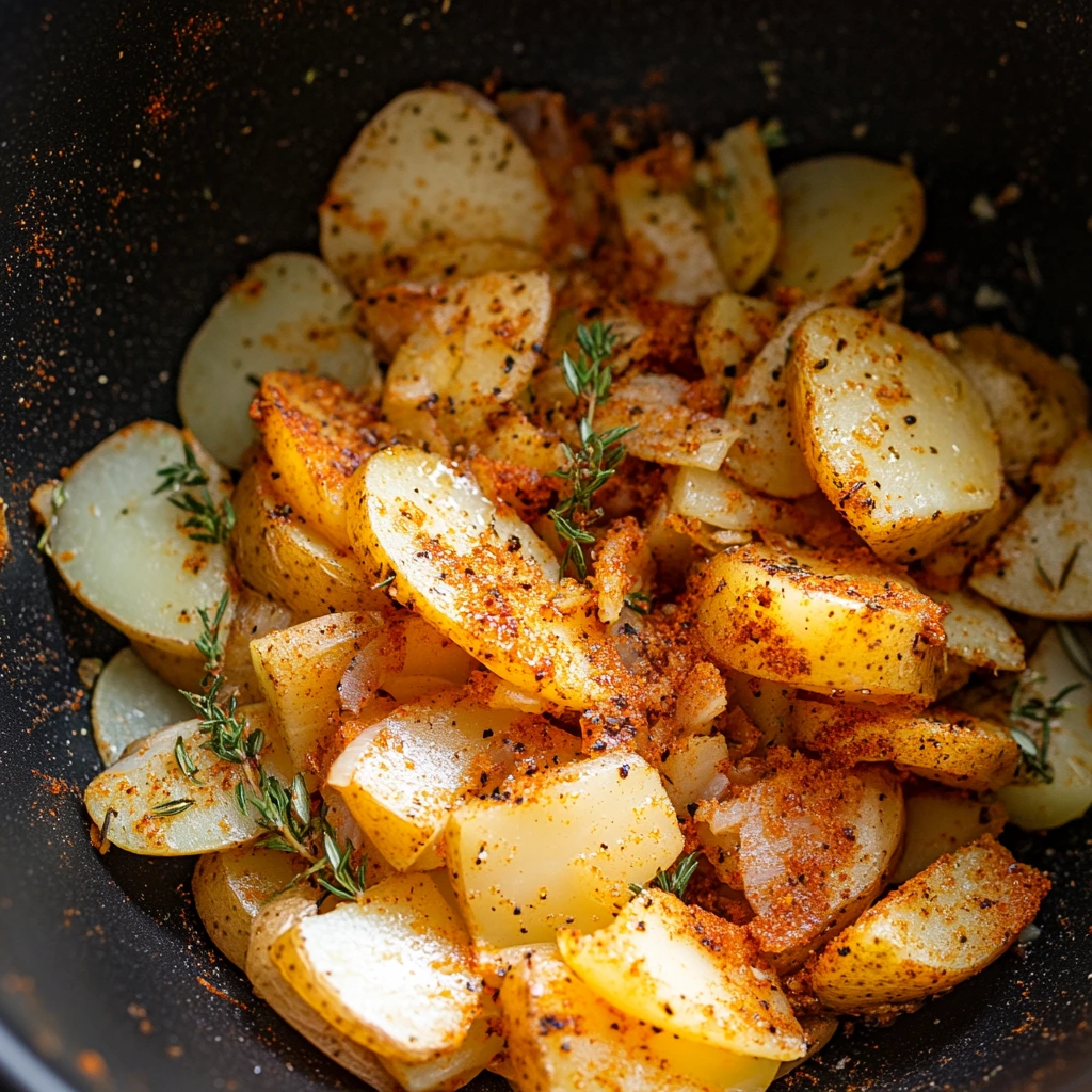 Now for the flavor! Drizzle the olive oil over your potato and onion mix. Then add the garlic powder, paprika, and thyme or rosemary if you’re using it. Don’t forget a generous sprinkle of salt and pepper. Use your hands or a big spoon to toss everything together until the slices are well coated. Every piece should have a little seasoning and oil clinging to it—that’s what gives you that golden crust in the oven.