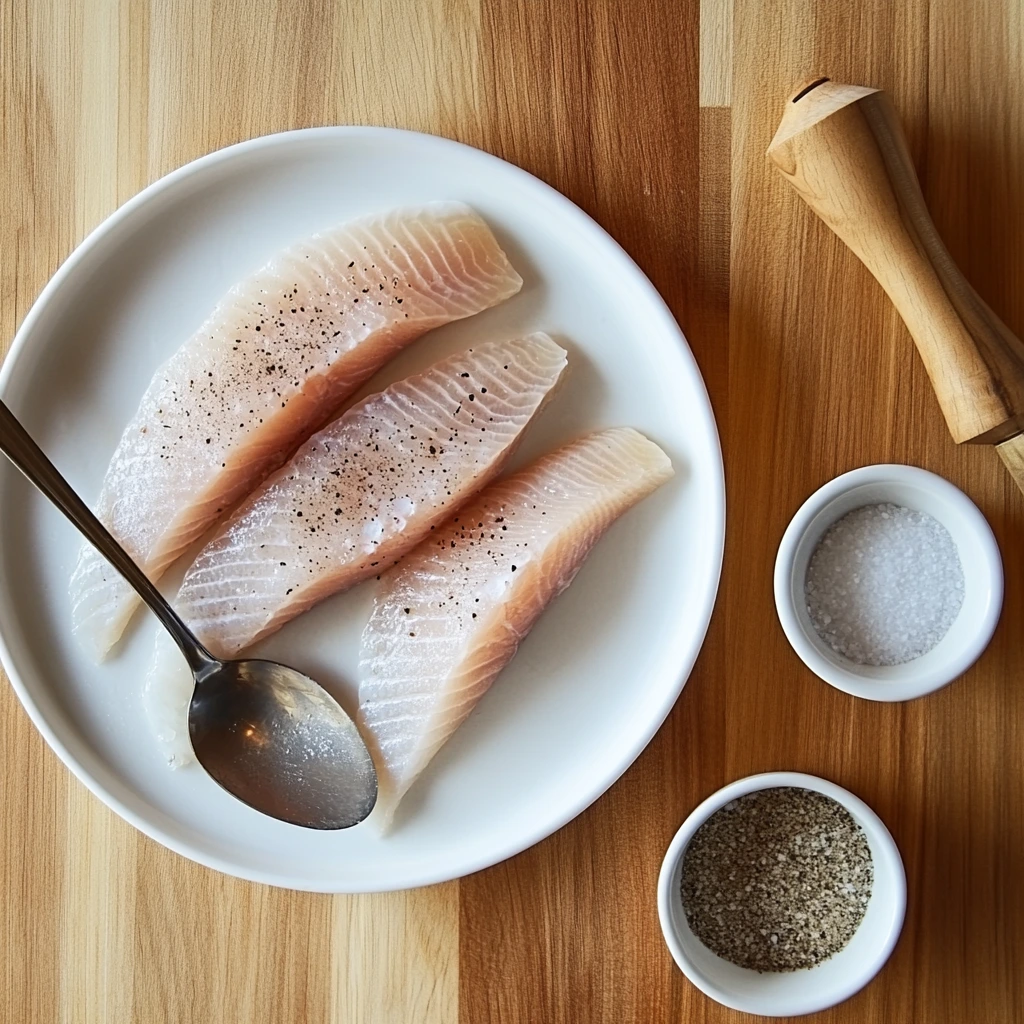 First, pat your fish fillets dry with a paper towel—this helps them brown better. Season both sides with salt and pepper, then lightly coat them in flour. Shake off any excess so you get a thin, even layer. This flour coating is what gives the fish that golden, crispy texture when pan-fried.