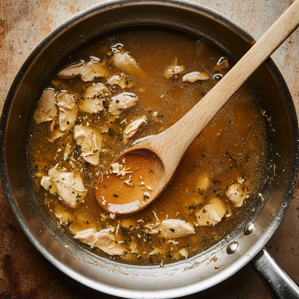 In the same skillet, add chicken broth and lemon juice. Bring to a simmer, scraping up any browned bits from the pan.