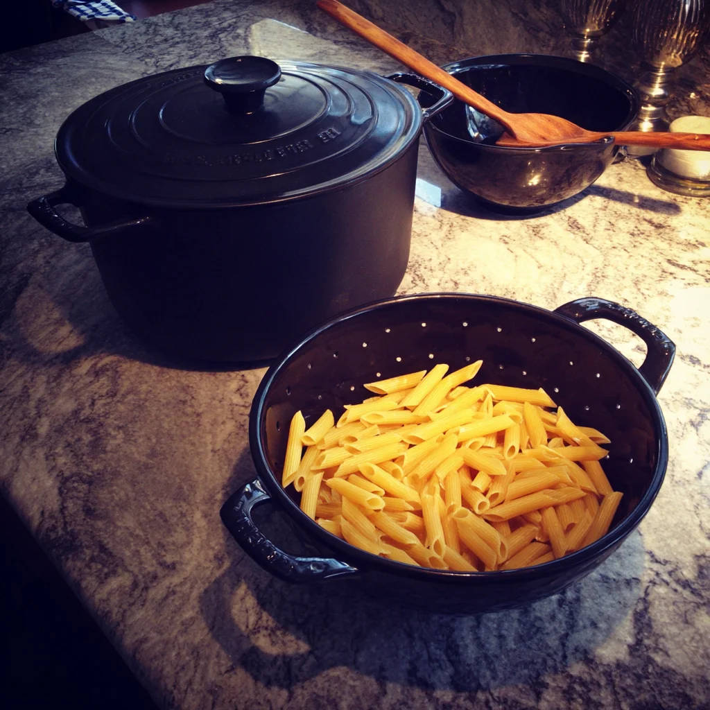 Cook the penne pasta in salted boiling water according to package instructions until al dente. Drain and set aside