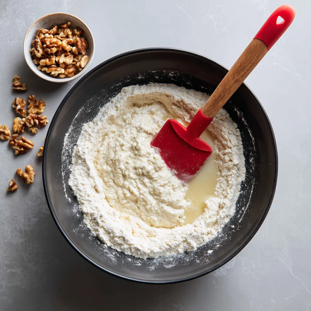 5️⃣ Add the wet ingredients to the dry ingredients and stir gently until just combined. Do not overmix. Fold in the nuts if using.