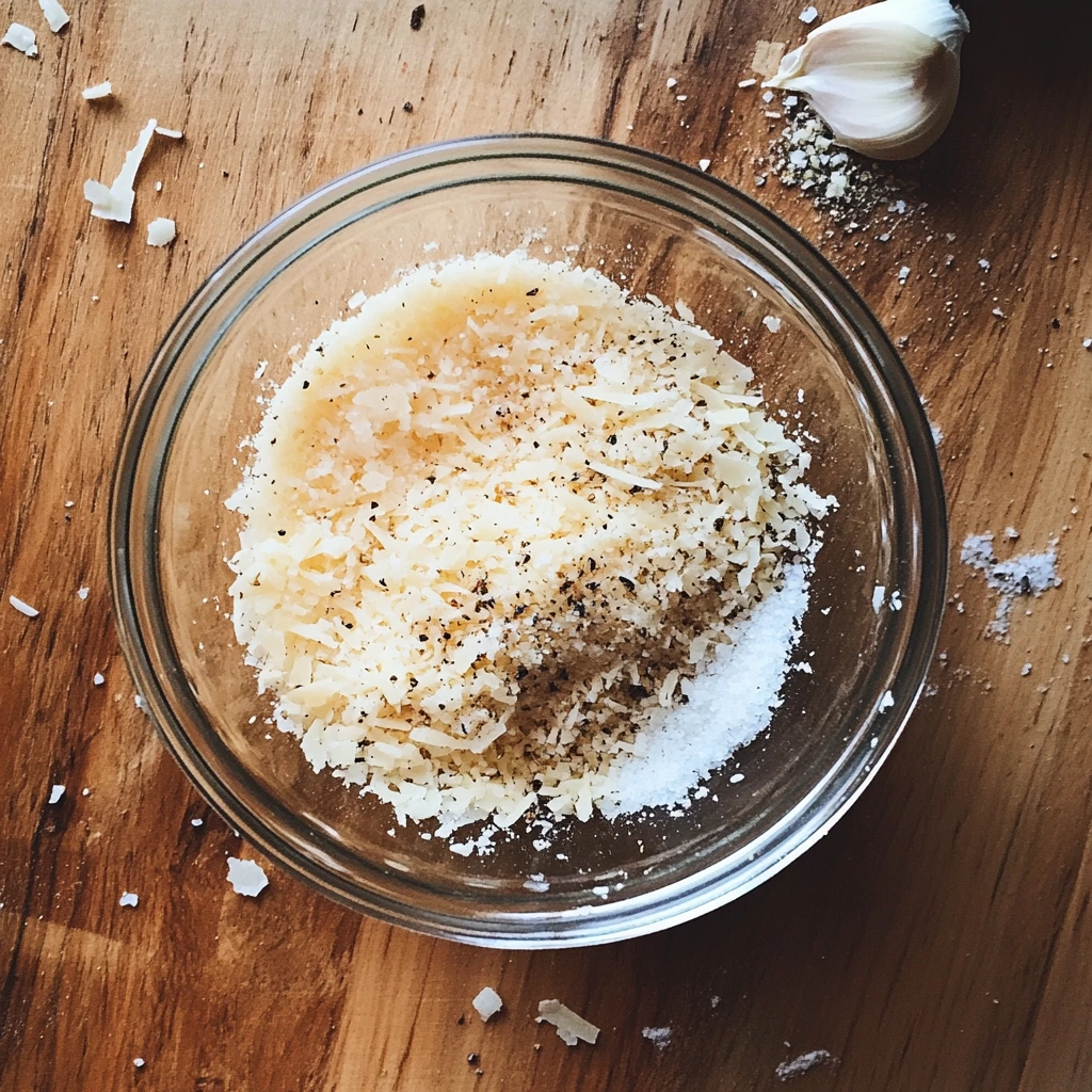 In a small bowl, mix together the grated parmesan cheese, garlic powder, Italian seasoning, onion powder, kosher salt, and black pepper to create the seasoning blend.