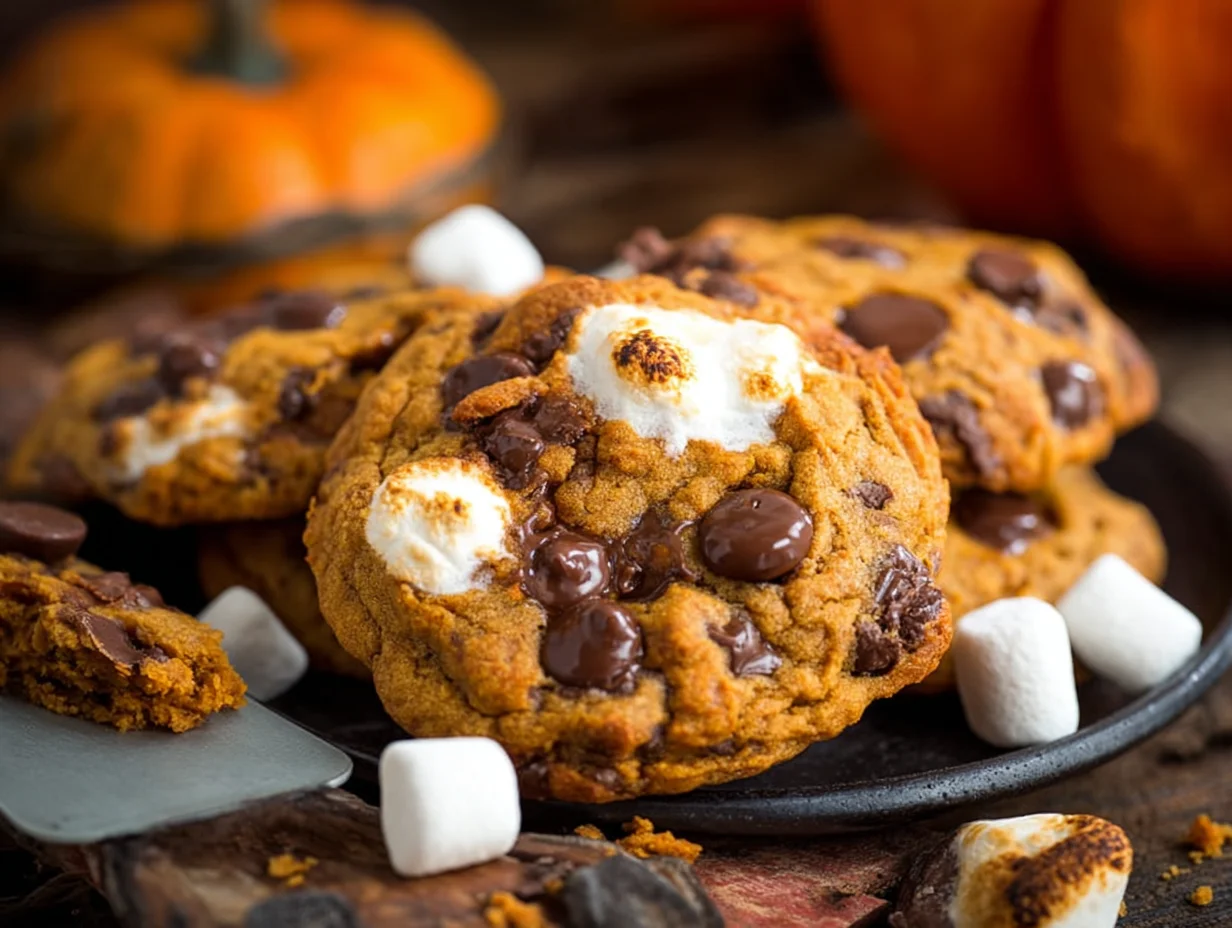 Use pure pumpkin puree, not pumpkin pie filling, for the best texture and flavor. The cookies may appear soft at first but will firm up as they cool, maintaining a chewy, gooey center. For extra toasted marshmallow flavor, you can broil the cookies briefly after baking, but watch closely to prevent burning. Store leftovers in an airtight container for up to three days.