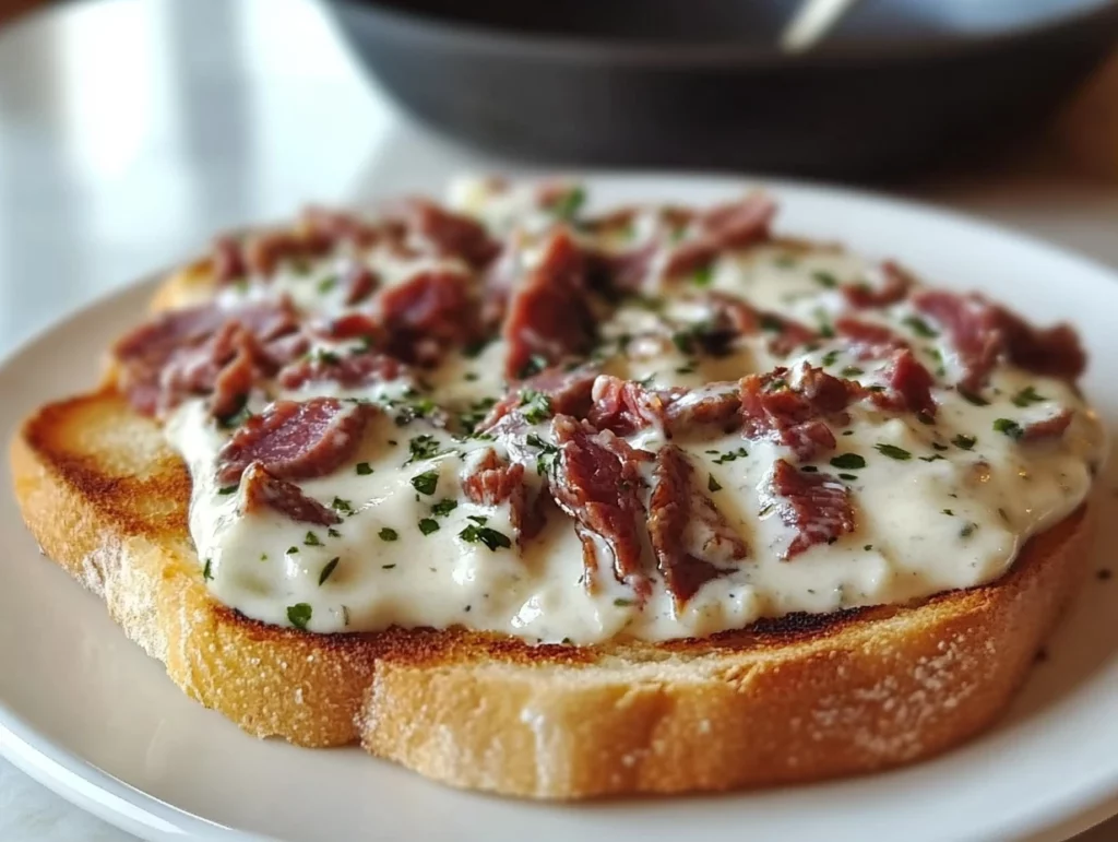 A classic comfort dish featuring tender ribbons of dried beef in a rich, creamy white sauce, served over crisp toasted bread. This hearty breakfast or brunch staple comes together in under 20 minutes and delivers savory, satisfying flavor with minimal effort.