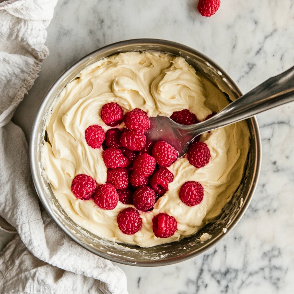 Carefully spoon the batter over your prepared raspberry layer. Because the batter is on the thicker side, I like to use an offset spatula to gently spread it out evenly across the top. Take your time here to avoid disturbing the raspberries underneath — they’re happily settled in place, ready to bake.