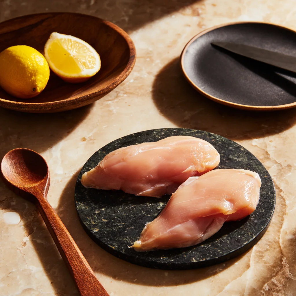 While that’s heating, grab your chicken breasts and slice them in half lengthwise. This gives you thin cutlets that cook more evenly and faster. No one likes overcooked edges and raw centers — slicing them thinner makes all the difference.