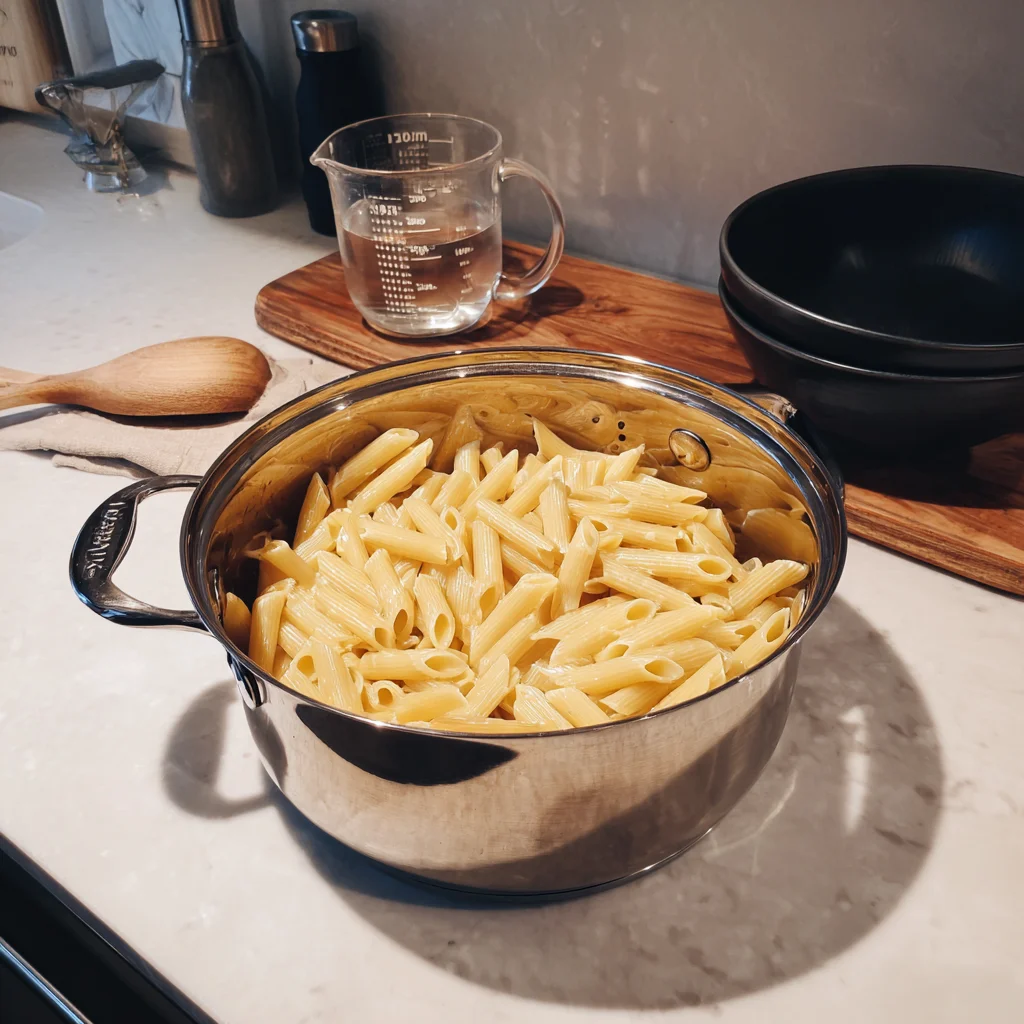 Start by bringing a large pot of salted water to a boil. Cook your penne according to the package instructions until it’s al dente — tender but still with a little bite in the center. Before draining, be sure to reserve about ½ cup of the pasta water. This starchy liquid is gold when it comes to loosening up the sauce later without watering it down.
