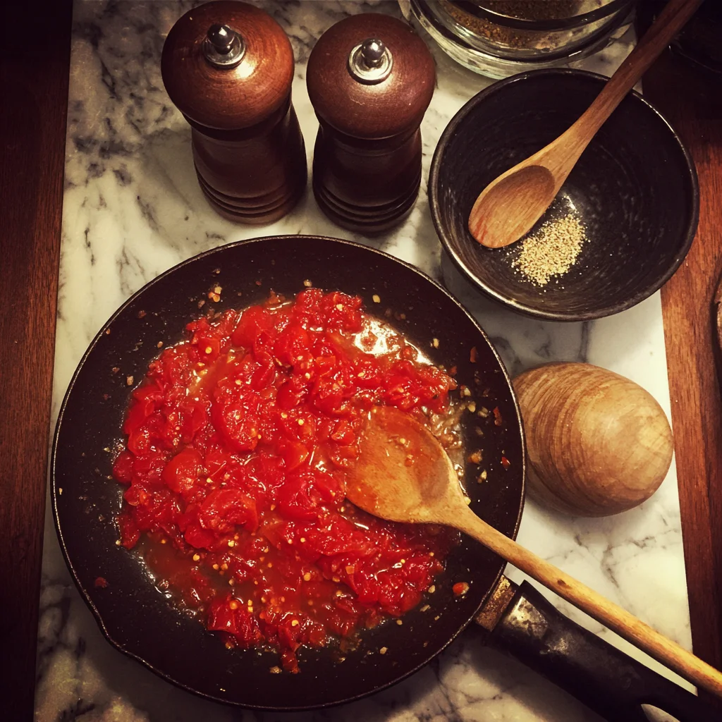 Pour in the crushed tomatoes and stir well. Season with salt and black pepper to taste. If the tomatoes are too acidic, add a small amount of sugar to balance the flavor.